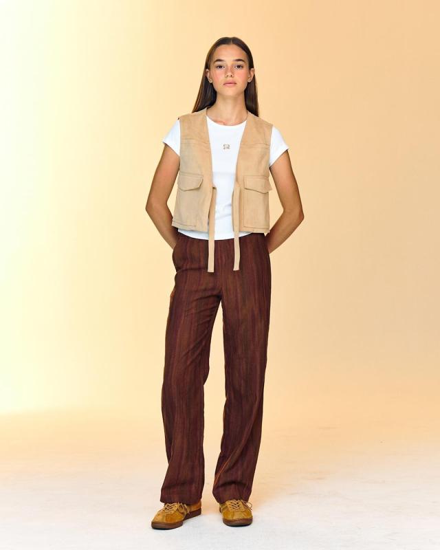 스웨이드 느낌의 멋스럽고 편한 조끼랍니다 :) 고급스러운 색감과 앞에 달린 끈이 포인트💕