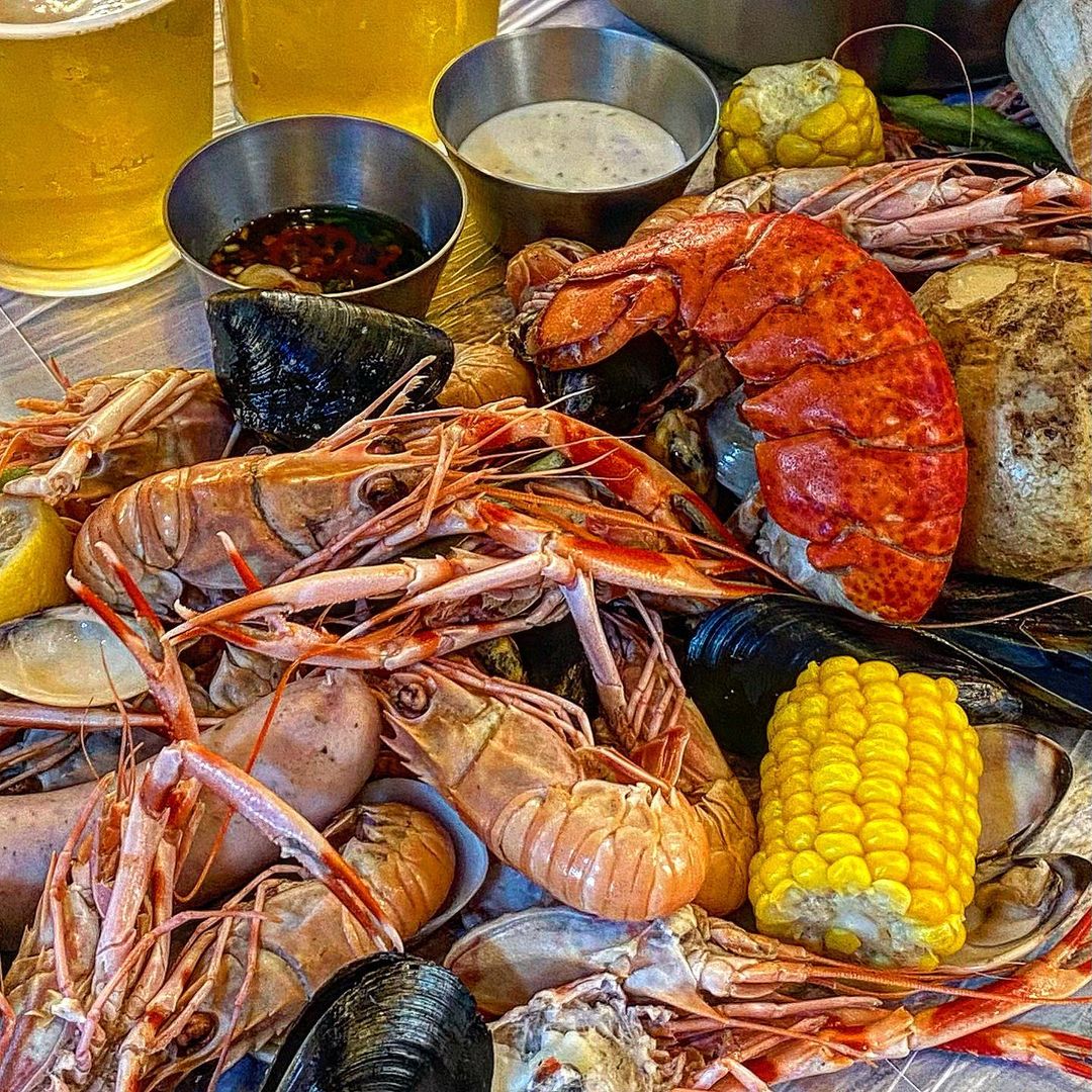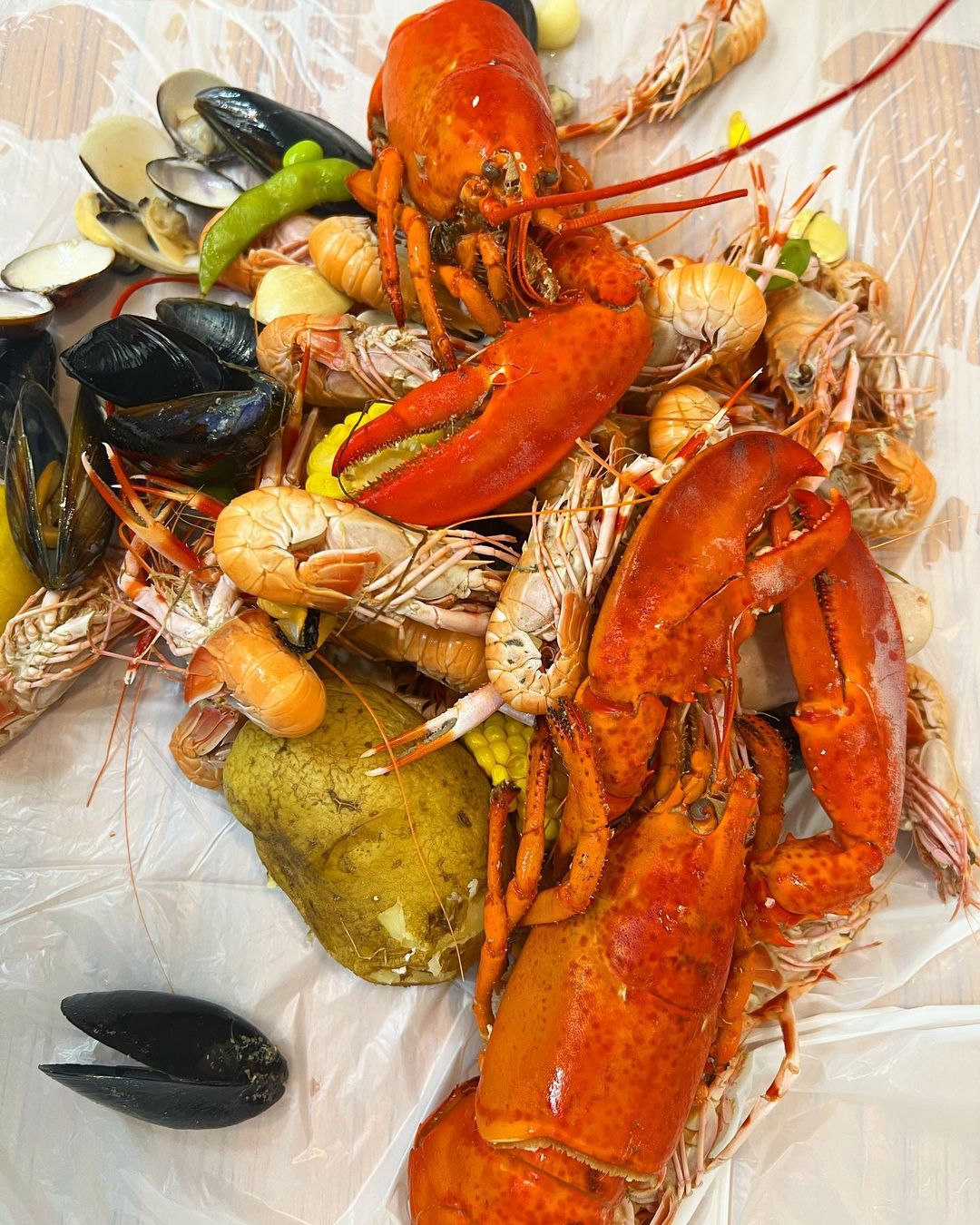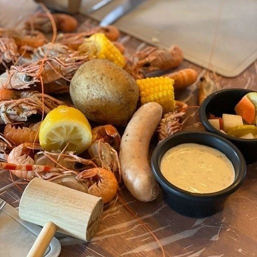 딱새우 사이 사이 옥수수, 감자, 소세지. .