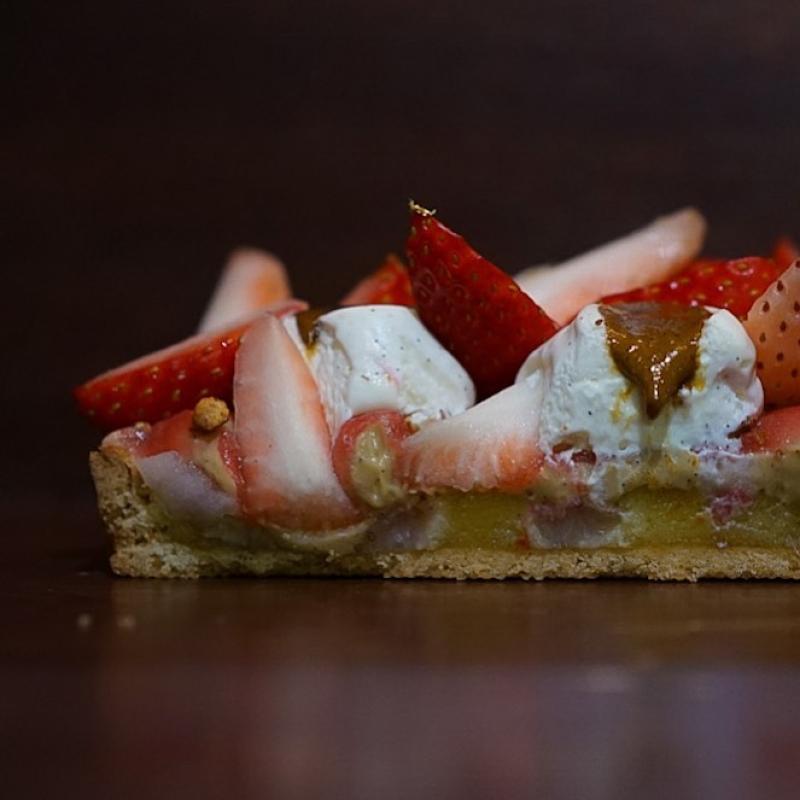바닐 피스타슈는 이름 그대로 바닐라와 피스타슈로 도배된 구성. 바삭한 빠뜨를 바닐라피스타치오 가나슈로 가득 채우고 그위로 바닐라 비스퀴, 비스퀴 옆 빠뜨 테두리를 따라선느 바닐라 피스타치오 프랄리네가 들어갔다. 윗 부분에 올라간 것도 바닐라 피스타치오 크림과 바닐라 피스타치오 크레뫼. 크림에는 피스타치오 분태까지 둘러서 뿌려져 있었다. 분명히 피스타치오가 가득 들어서 피스타치오의 꼬소함이 진하게 느껴지는데 동시에 바닐라의 향도 듬뿍 느껴지는 것이 신기했음. 꾸덕한 가나슈도 윗부분의 훨씬 부드러운 질감의 크레뫼와 크림도 진한 피스타치오 맛이 좋았다. 내가 싫어할 수 없는 타르트라 생각했고 역시 기대만큼 맛있었던 타르트.