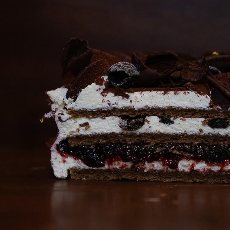 초콜릿 시트지에 얇게 초콜릿을 입혀준뒤 그랑마니에르 시럽을 듬뿍 적시고 샹티크림과 층층이 쌓아 완성된 포레누아 입니다.